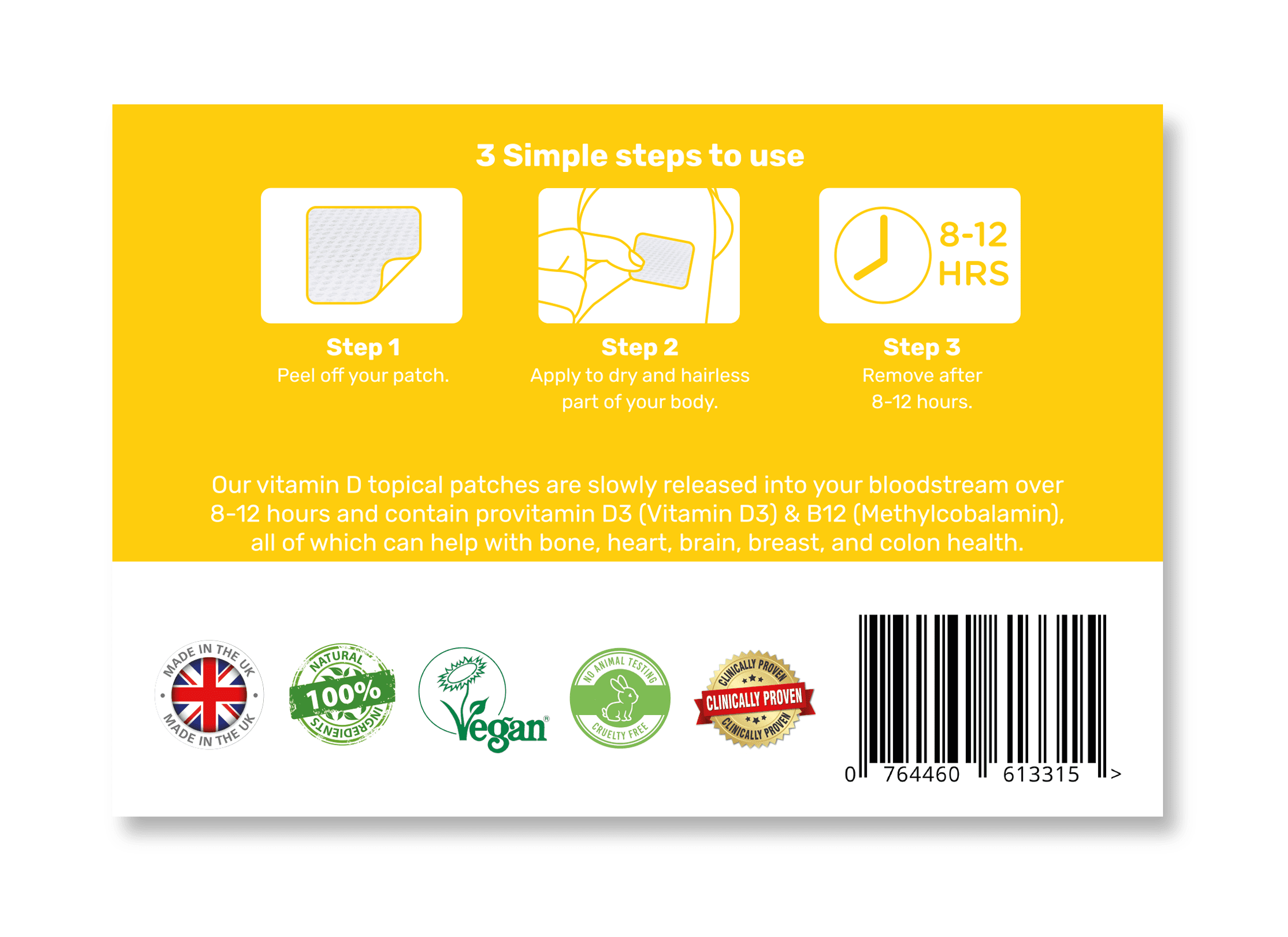 Our bodies naturally produce Vitamin D when exposed to UV sunlight, as we get older our bodies ability to manufacture Vitamin D decreases. Vitamin D Topical Patches contain Provitamin D3 (Vitamin D3) & B12 (Methylcobalamin), all of which help with bone, heart, brain, breast and colon health, can help with bone health/strength and could help prevent osteoporosis, diabetes, migraines, pre-menstrual syndrome, relives anxiety and a healthy heart.